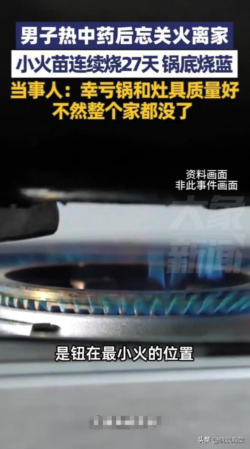 信息来源:@大象新闻·8小时前:9月6日,浙江台州,男子热中药后忘关火离家,小火苗连续烧27天锅底烧蓝,当事人:幸亏锅和灶具质量好,不然整个家都没了