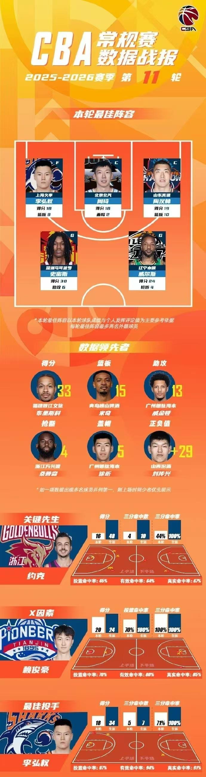 CBA官宣常规赛第11轮最佳阵容,周琦8中7高效得到18+6+2+2帽,率领北京88-83险胜宁波保持队史交锋11战全胜战绩;李弘权18+8+4率领上海大胜终结卫冕冠军广厦8连胜,陶汉林、史密斯和威尔斯也给力表现入选。